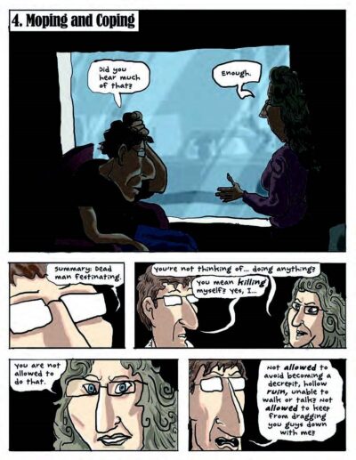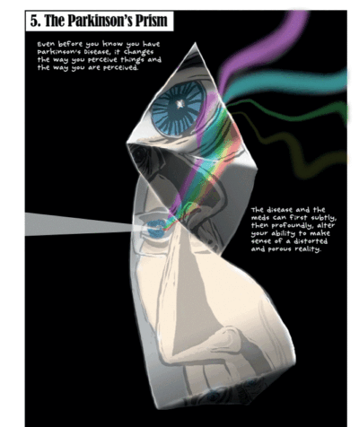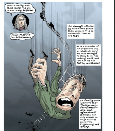 We then get to Chapter 3 and the interview with the disease. I knew that it was not going to be easy and I appreciated the humor countering the seriousness. But even with the humor, things go deep (sometimes things are darkly funny). And while the artwork helps counter this with the actual humor (though some of the commentary by the narrator is funny) we still get a punch in the gut. Such as showing Parkinson’s as a dapper, oddly shaped/looking person the author/patient interviews. Around page 30 we get the lowdown of more symptoms, issues, history and even a false hope for cures from Parkinson’s themselves. Here I “walked away.” I stopped reading. I will finish it, eventually, but at that point… Please read this, if you can. Maybe some day (after I finish it) we can talk about it.