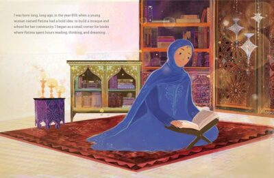 Behind My Doors is told from the point of view of the subject. The Al-Qarawiyyin Library in Fez, Morocco. We learn it is the oldest library as it was started by a Muslim woman in 859. We see how the library was a small collection, then would grow and grow and finally outgrow the space, making many books to be put elsewhere and the library start to go into disrepair. The seemingly small events will have an outcome of international portions when a young girl walks by the doors as a child and what she would do as an adult. Khan’s text is a love letter to this library. The voice of the library is that of a beloved older relative or teacher. Adani’s illustrations show the history and the culture with popping colors and massive amounts of details. It is just freaking gorgeous!