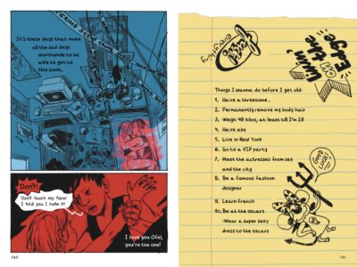 Focusing on the two main points of illustrations and originality, I realized they were the pieces that gave the book a bad name. And perhaps, any good name someone could give it. Now, I cannot draw a stick figure and my fancy item I can draw is a green dot on the page as it is an ant wearing a green sweater, so I am not saying I could do better, but what it boiled down to was I was nauseous watching them. And not just when they are showing our main characters seriously bad trips on LSD, heroin, coke, pills, you name it…. As her face is melting, her eyes growing bigger than her face, people pull her face into a smile, and everything is spinning and big scribbles on the page. And I don’t just mean when she is giving her Health Ledger Joker Grin of lipstick practically up around her ears. No, even when she is just sitting at the table things are disturbing. Maybe because you know what came before and that there is more of the same coming, but it was a wrecking ball!