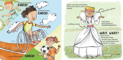 History has many layers. Dresses can have many layers. But whereas history plays out, it is hard to play most sports or ride a bicycle in dresses. Especially the outfits that many women athletes would wear before some enterprising women decided to change things up. This Skirt Won’t Work!: How Women Athletes Changed Their Clothes and Changed the Game by Jennifer Cooper and illustrator Eva Byrne follows how tennis went from a long skirt to a 1920s fashion statement. How women hockey players would change the look of their skirts. How a bicyclist could go faster with a form of pants.
