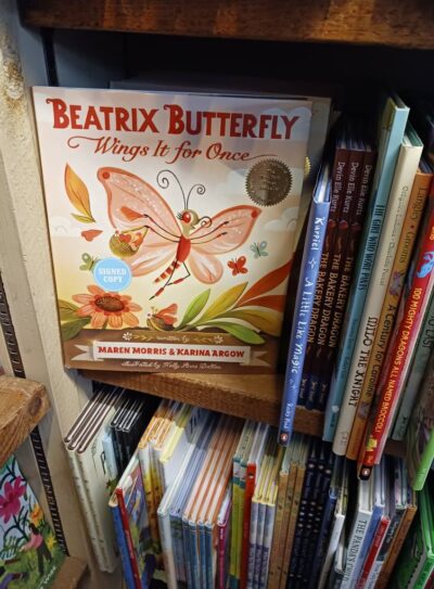 I was looking for books for a couple of orders at work the other day and in the process looked at the faceouts of new picture books lining the shelves. One of them was Beatrix Butterfly Wings It for Once (Addie Ant’s Garden Friends) by Maren Morris, Karina Argow and Kelly Anne Dalton (illustrator). It has a funky, cute, interesting cover. It has pinkish-reds and just was sitting there, pushed back from the edge. It was hiding in the shadows. I pulled it forward to try and “clean it up”/make it look nice and not so sloppy, and it fell off the shelf, into my hands and opened all by itself, so I had to read it.