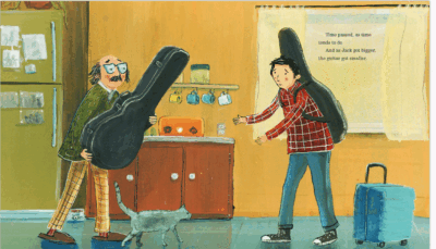This is all wrapped up in some easy but not simple illustrations. They have an old school and yet, modern feeling to them as well. They are not bold, but not muted and set the tone for things. The cuteness of the boy in pajamas as he is holding a bowl of cereal or sitting on the porch swing holding a too large guitar is both adorable and foreshadowing to what is to come. Things are emotional and have a hopefulness to them.