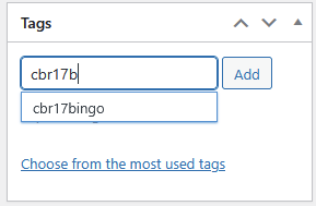 Books must have been read during 2025.- You must tag the review on cannonballread.com with cbr17bingo and not any other variation. When using the auto-fill, start typing “c…b…r…17…b…,” and make sure you are selecting cbr17bingo from the dropdown below.. Please do not add the ‘#’ in your tag, just the text cbr17bingo, all one word. Do not add any level-related tags; cbr17bingo is the only bingo-related tag necessary.