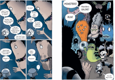 Stitch Head: The Graphic Novel by Guy Bass and Pete Williamson is a cute retelling of the Frankenstein monster story with modern twists. Plus it includes the ideas of friendship and how they change and grow. While I am not in the BEST EVER category for this title, there was a coziness to it that I enjoyed, plus the humor was quirky and not too young or “stereotypical” (though there is some of that, too). Sometimes things are a bit “edgy” so it is good for stronger readers aged 8 to 12. If you are fans of the novels (which I have not read, but might try now), this graphic novel is a good addition, but also a good way to be introduced to the character of Stitch Head.