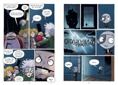 There is also a feeling of Pinocchio (not the puppet wanting to be a boy, but because there is a really bad circus owner) and is similar to many stories that have the Creation vs. The Bad Situation as its main theme. We have an unusual cast of characters: Stitch Head (see the cover), a monster that is a werewolf/Frankenstein monster combo, and a village girl that has secrets. She is somewhat Pippi Longstocking meets Wednesday Addams, but has her own personality. There is a comment that is said by her grandmother that makes me think that the family has a few connections to the castle on the hill, but I won’t learn about that until book two (which I have NO idea when it is coming, so I probably do have to find the novels, unless they take their own unique journeys).