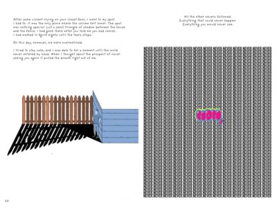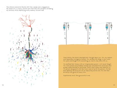 Due in September 2025 I read via an online reader copy, though I would like to find a finished copy when it comes out as I am curious how the raw, edgy illustrations come out. The text (due to it being online and to fit my screen I had to make it smaller) was physically small and hard to follow sometimes, but the images really make what the author was saying stand out. Needles float down as a waterfall, a scribbled mind monster, the popping pink word MOM surrounded by the word NEVER so tight it looks almost like a solid block is just the tip of what happens on the page.
