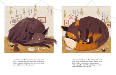 While the title of The Slightly Spooky Tale of Fox and Mole (as did promotional material) does say slightly spooky, I felt it was spooky and one should drop the slightly! However, it is not necessarily over the top so most ages at least five and up could read and the adult reader will understand the metaphor of friendship and selfishness, plus anger about being taken advantage of.
