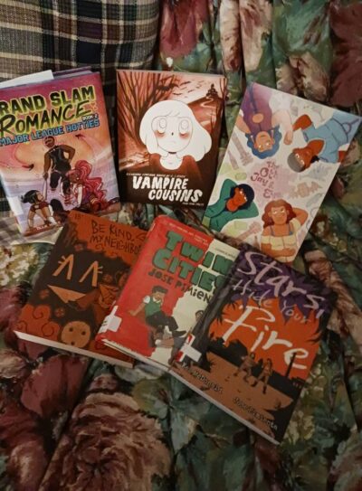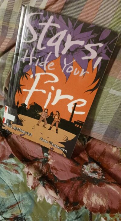 Twins is a “That’s good, let’s read others by Pimienta” book. Yet, before I knew that I picked up a copy of the graphic novel, Stars, Hide Your Fire. I thought it was a dual author/illustration combo by Pimienta as well, but the story is by Kel McDonald with Pimienta illustrations. I was hoping it would be a nice story about friends, but maybe have a little edge. Unfortunately, it was not nice. It was spooky! It has witches/fairy/bad supernatural creatures. It has magic and while it is all wrapped up in the disguise of a fairytale it is a middle grade thriller/horror. While nothing horrible happens, it is not for a sensitive reader.
