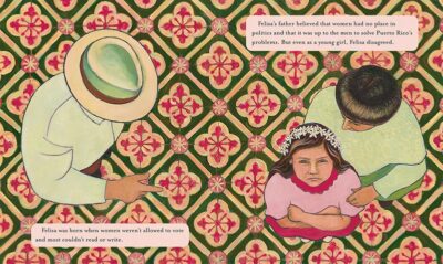 We find these and other amazing facts about her in Doña Fela’s Dream: The Story of Puerto Rico’s First Female Mayor by Monica Brown and illustrated by Rosa Ibarra. Though it is currently available, I read it via an online reader copy. I think I will be looking into getting copies of the book for my local libraries and along with Claudia Said Sí!: The Story of Mexico’s First Woman President by Deborah Bodin Cohenm, start a collection of women politicians for my great niece.