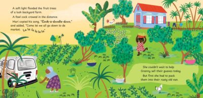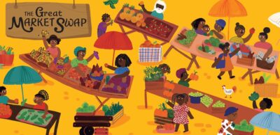 Juliana Eigner created some fun and slightly funky illustrations that wrap things up neatly and keep things humming along. The story is set in a small village where the grandmother and grandchild are heading to the market to not only see old friends, but to sell wares. We learn about the different people and how the market is important. Such as if they don’t sell their goods, one family will not be able to purchase other foods, or clothing. Another would have to eat the vegetables they are selling for all meals for a long time to come. But that’s usually not an issue until the day there is an accident that blocks buyers from coming to the market. And of course, our narrator figures out the best solution.