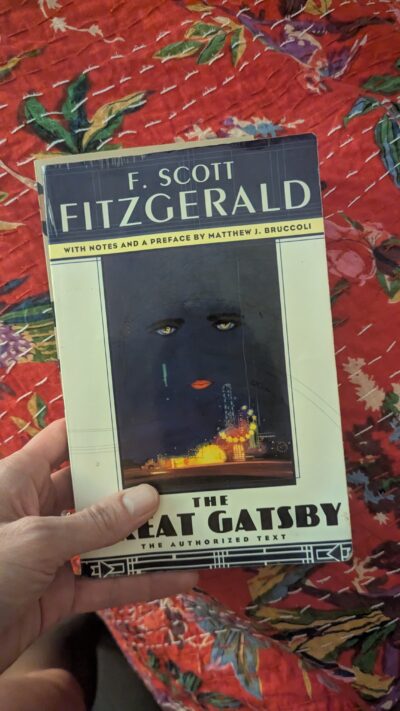 ecame engrossed in their various screens. I didn’t want to disturb the peace and I also didn’t want to do chores, and I couldn’t find my Kindle, so I reached over the bookshelf and I picked up the dog-eared copy of The Great Gatsby that I purchased in approximately 1999 – I was delighted to see my youthful handwriting and my maiden name on the inside cover.