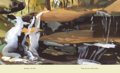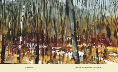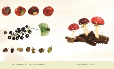 You can judge the book by its cover. It has that poetic, artistic look to it. It uses both light and dark colors, shadows and even open spaces to support the story. Things are both realistic and a bit abstract done in watercolors. The best way to describe everything is to say it is both clever and complicated, but with a simplicity that makes it accessible. You are not just learning about a mountain, or the seasons, but overall nature and how we are a part of it. This shown by the mountain letting you know what senses you should use to help you enjoy and appreciate the setting.