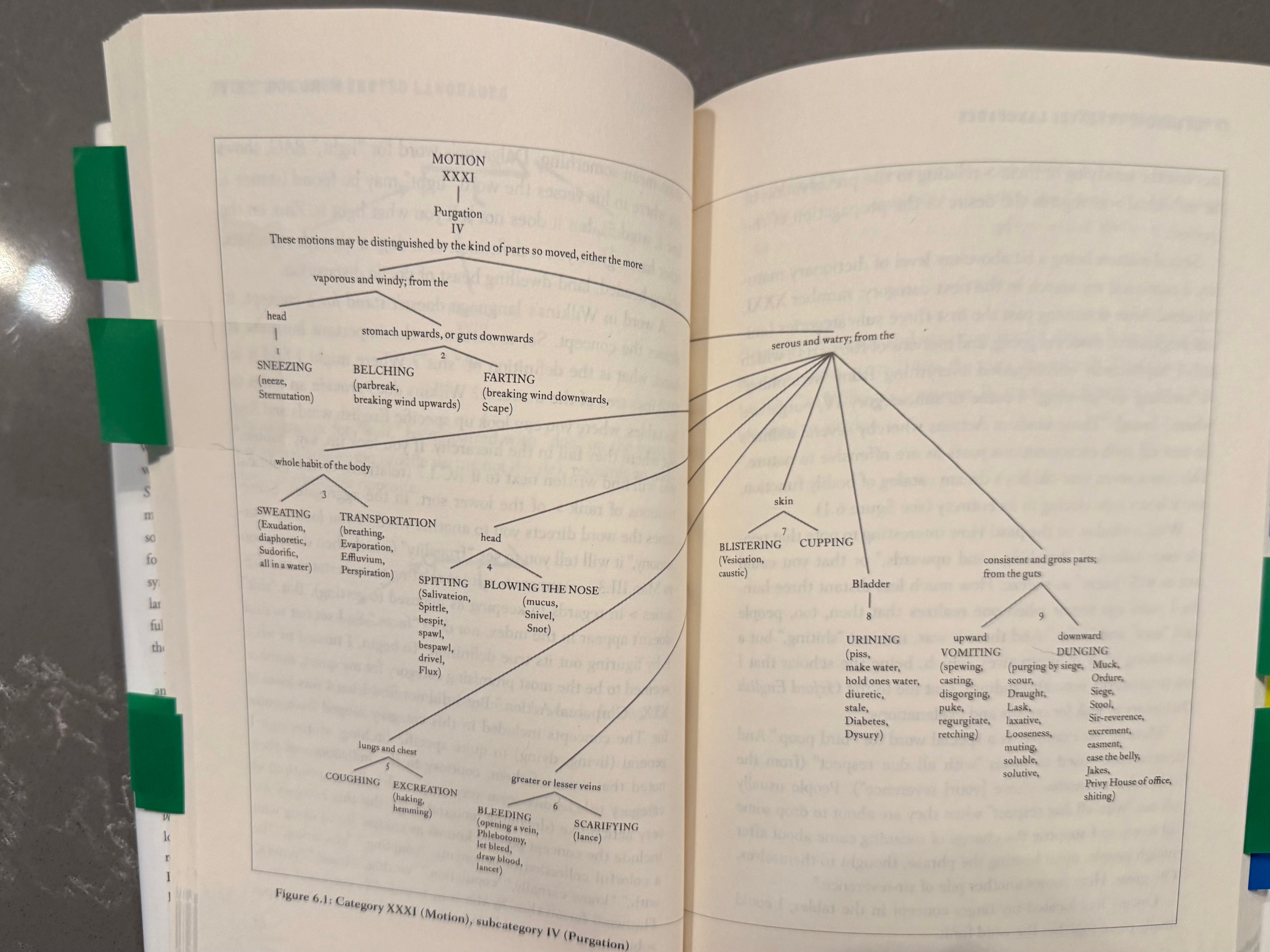 John Wilkins, 17th century co-founder of the Royal Society, was one such visionary who thought he could improve upon language by leveraging science and mathematics. In Wilkins’s view, the problem with language is that words don’t tell you anything about the word you’re defining. Sure, we know what a “dog” is (or a “chien” or a “perro”) because we agreed to a definition. But for language to be truly useful, a word has to not only “stand” for a concept, it has to define it. Wilkins started by organizing every word in the English language into a 600-page treatise filled with taxonomic trees. For example, he organizes every type of purgative action a human body can experience into one handy chart, to the delight of the author and 13-year-old boys everywhere.