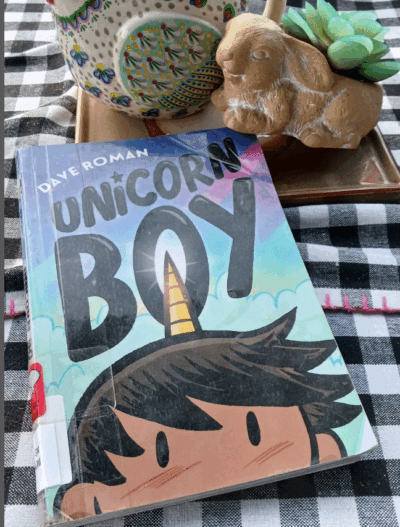 One weekend I had no energy to do anything but move my eyes across a page, as I sat and turned pages of a book. Therefore, I sat on my porch, propped a book onto the table that lives there and read Unicorn Boy Volume One by Dave Roman. Which if the cutesy cover didn’t clue you in to the fact that it is a super fluffy and light book, the title would have. Not to say it is bad, but for an adult who had just finished the horror book Black Flame by Gretchen Felker-Martin it is just what the reading doctors ordered.