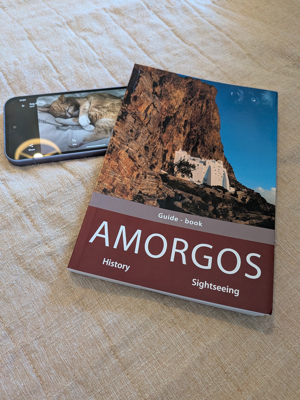 Amorgos is a small island in the Cyclades area of Greece – other islands that are more well known are Santorini and Mykonos. In the guide books there isn’t much information or history about it. I saw this book at a local shop and picked it up.