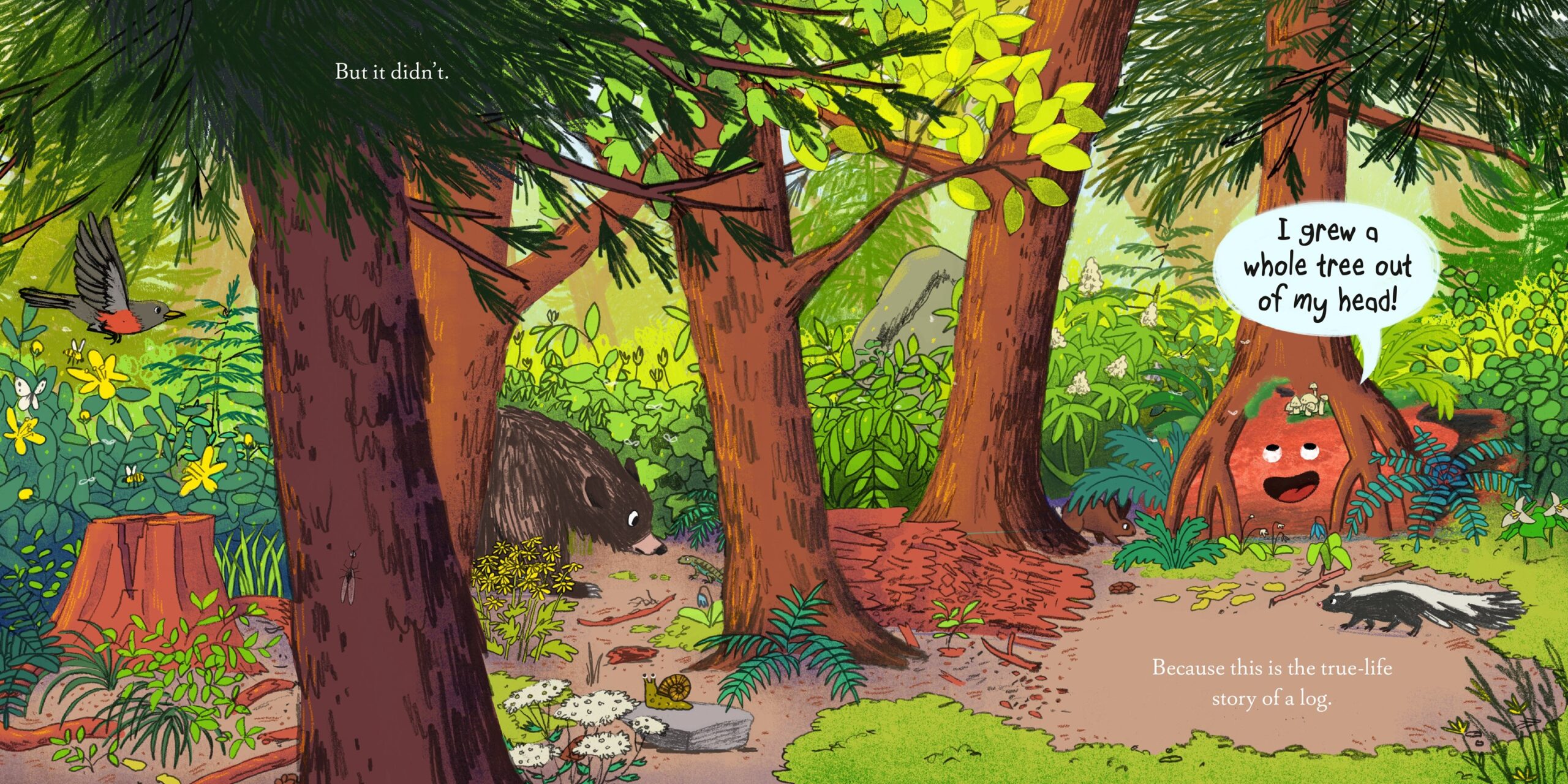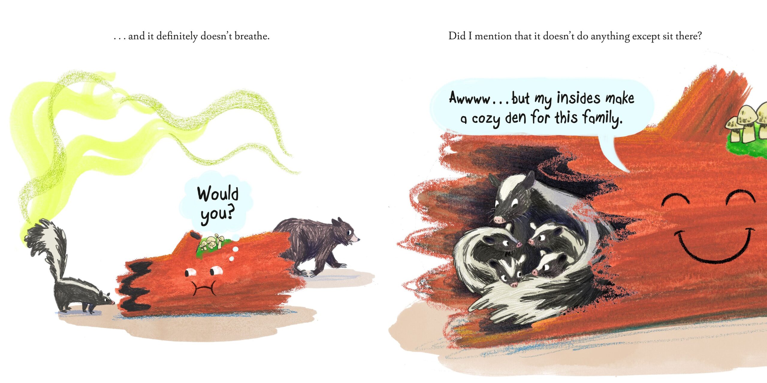 Well, this book turned out to be a fun and silly book about the adventurous life of a log. Clever text and illustrations adapt the concept for a younger reader, but can go for an older child as well. And of course, there are a few “adult jokes” that are far from inappropriate, but might go over some kids’ heads. We see how exciting a log can be. It is a house, food, shelter and so much more. Things you would probably never think about a log are given to you in a fun, but educational, way.