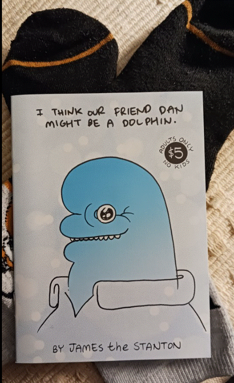 I think that James the Stanton might be a little crazy. Okay, a lot crazy. Afterall, why would someone write a book (or more actually a zine) called I Think Our Friend Dan Might Be a Dolphin and proceed to make one of the more warped things I have ever read (and honestly I think I’ve read several warped things).