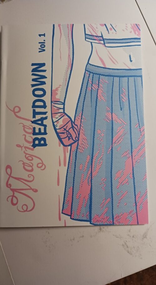 The first I read was Magical Beatdown, Vol 1 by Jenn Woodall. It is a short zine that is created with light (almost faded, but still popping) blue and pink colors, quickly drawn looking lines and is overly simplified. If you are a reader of zines, or are a fan of zines and/or books that are odd, edgy, and have “girl power” stories, then this is for you. As there is not a lot else going on. Well, there is a bit about arcade games, but that’s really it.