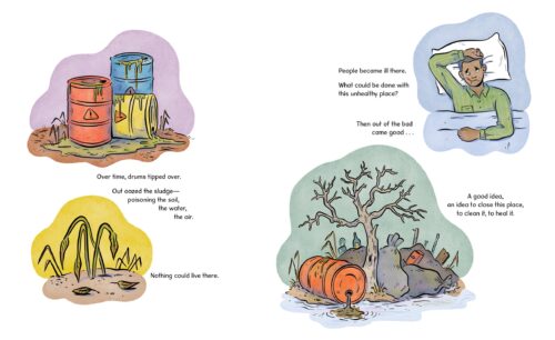 Diane Muldrow and Amy Jindra Hodgson (illustrator) put a lot of work into this picture book (which I read via an online reader and due mid February 2026) and I can appreciate that. I would like to know more about them, ask questions about their interests in environmentalism, and why this particular subject. One part I enjoy is that though there is history behind the subject (the toxic dump site was started after the second world war) it would go into modern day. The fact that we might have started this clean up and our environmental pushes in the 1960s and 1970s much of this clean up will have been done in most listeners and readers’ lifetimes. Some things happened as recently as 25 years ago and even more recently.