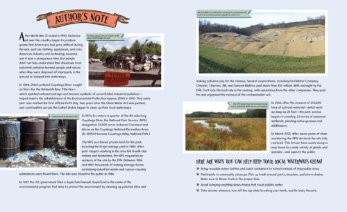 Starting off almost poetically, Once a Wasteland: From Toxic Dump to National Park moves into the facts quickly. Everything is laid out in simple, but not simplistic terms. The overall tone is good, it allows you to access a piece of history and the extras allow the book to grow with the reader. However, “points” are lost due to the fact environmental stories are not new, it was not necessarily told in a new manner and I had questions that were not answered, such as it is great that we can store the waste, but not now what? What happens to the buildings where it is stored? What happens if there are accidents, natural disasters, human intervention? The illustrations are a nice addition, with their good colors and medium details that help keep things lighter but still able to show the seriousness of things.