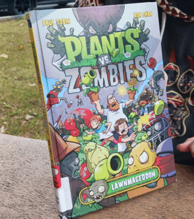 One day I was with my oldest nephew and I thought I’d take him to the library and pick up a few books to read. I was having trouble getting him to engage (he’s special needs and this was way out of his routine, so it was expected). After I started grabbing a couple titles on a whim (covers do make a difference), we wandered to the checkout desk. It was then I realized that maybe I had missed his interest level (one never knows what will grab his attention) and in a “just in case” moment, I pointed to a cart of younger graphic novels. There was this faceout near the bottom of the library cart’s graphic novels. He noticed this book, Plants vs. Zombies Volume 1: Lawnmageddon (I did not realize it was book one, but good for us), but he walked away from it. He had shown interest in it, and the one thing I do know is that sometimes he doesn’t know what is good for him.
