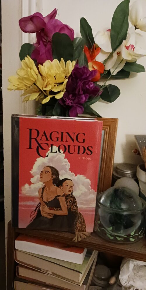 Books sometimes find me. I was going to the library to pick up some I had ordered and Raging Clouds by Yudori was sitting off to the side of the entrance. I almost didn’t go that way to the checkout desk (I usually go left, not right) but something made me go right. And there it was. Fat, shiny and new. It was shyly facing away from me. And that’s the last time this book was shy.