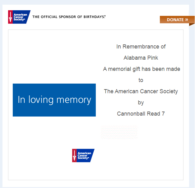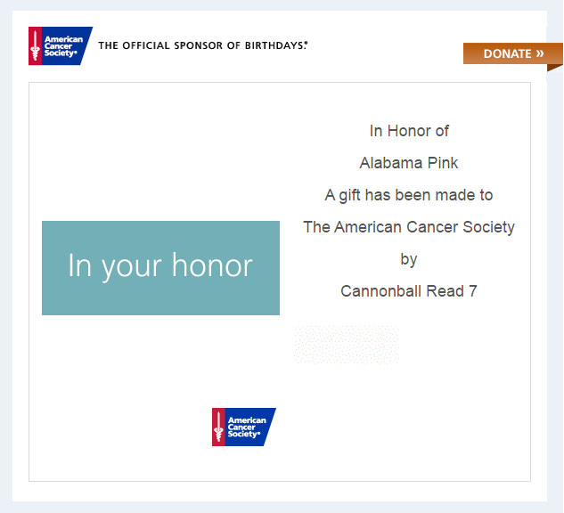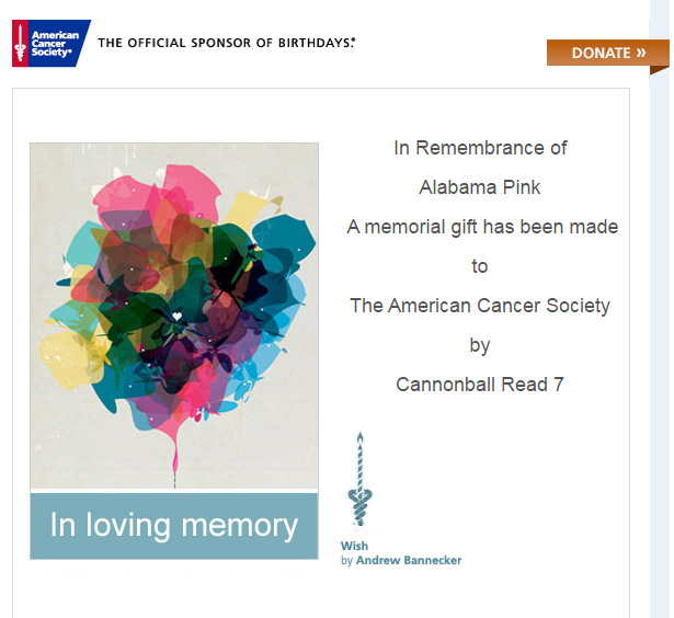 Huzzah, we’ve made another donation to the American Cancer Society, of $75.00! Don’t forget, ANYTHING you order on Amazon after visiting our affiliate link will generate revenue. So if you’re searching for a bathing suit or sunscreen, or a new barbecue grill, it all helps, not just books.