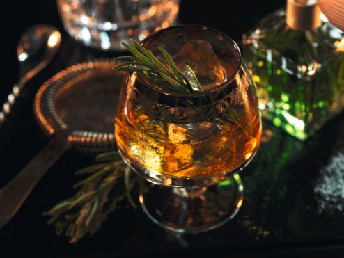 Stir the ingredients over ice in a mixing glass or tin. Strain over ice into a brandy balloon and garnish with a sprig of rosemary. For an added touch of decadence, spray a mist of absinthe over the cocktail. If you are feeling especially brave, you may even flame the absinthe mist as you spray.
