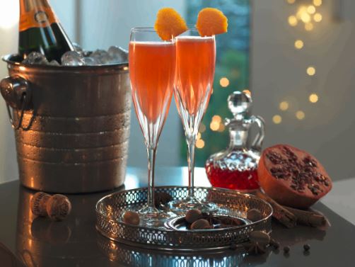Pour a glass 2/3 full of champagne. Add 20ml of the cooled spiced syrup (or your store-bought stuff) and stir. Garnish with an orange zest and pomegranate seeds.