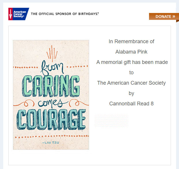 Woohoo! We’ve made another donation to the American Cancer Society! This time in the amount of $100. That brings us to $475, and so we’ve already exceeded last year’s donation amount of $435. Find out what else you can do to help our mission to fight cancer.