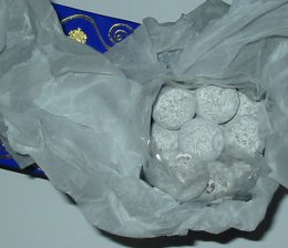 Each chocolate is covered in powdered sugar on the outside. Biting through the think chocolate shell you bite in to a lovely, almost liquid centre of the champagne ganache.