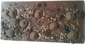The first bar (I’m reviewing, not that I made) I called “Dave’s Delight” because this was the one I gave to my husband. Thankfully she shared some with me. I created for him a combination of cappuccino buttons, gold flakes, coffee and I think possibly cocoa nibs in milk chocolate. I have to say that he likes coffee and this certainly smelled strongly of coffee when we took it out of the packet. That coffee flavour was clearly present but not overpowering despite my selections. The milk chocolate in this combination wasn’t too sweet and as such I have to say I recommend this specific combination.