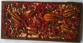 White chocolate with cinnamon, cherry and candied rose petals sprinkled with gold and silver flakes as it coming up to Christmas
