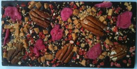 The last bar I made I called “Suggested Selection” because I went with the suggestions made at the top of the selection area. You might not notice but each time you select something then move to the next section there are suggestions made in the top row. This chocolate bar was a milk and white chocolate blend and the suggestions came out as cinnamon, cocoa nibs, pecans, raspberries and golden pearls. I have to say, I feared for my teeth in more than one way! The sour raspberries were a shock and weren’t quite blended with the flavours I had selected. Perhaps the gold balls was overdoing it a bit. I didn’t get too many pecans but when I did, they nicely balanced out the sweetness and cut through it a bit. Far too sweet for me but I’m sure some would like it 🙂