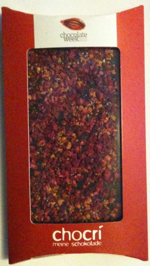 This particular bar was created for me. I had made three bars myself but this one was made by the Chocri people based on popularity and I have to admit it was slightly worrying. It has chilli *and* raspberries in dark chocolate. It was a brave combination and one I was happy to try.