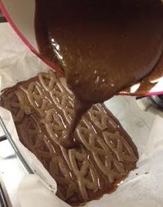 - Now, pour around half the mix into the prepared tin. Take the Curly Wurlys out of the fridge and lay four of them in the middle. If you want a firmer brownie, skip this step.