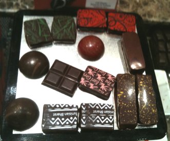 If there was one thing I learned it was that I had forgotten how LONG the walk to Demarquette is. I’d suggest their 8 minutes and mine aren’t the same. Regardless, I exited South Kensington and after walking at a slower pace than the jammed traffic, hopped on a bus which deposited me right outside the front door of the shop (late as usual). I dashed in, was handed a glass of red and all the chocolates they had tried up to that point and then sat through some really interesting talks by the head chocolatier. We got to try a huge number of chocolates including: