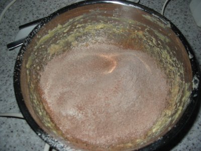 isn’t paper, I used a sieve to sift the flour and cocoa powder into the mix and gave it a mix with s fork. And a spoon. And a spatula. And the mixer. Then I added what was left of the chocolate bar I’d chopped up being 40g at this point.