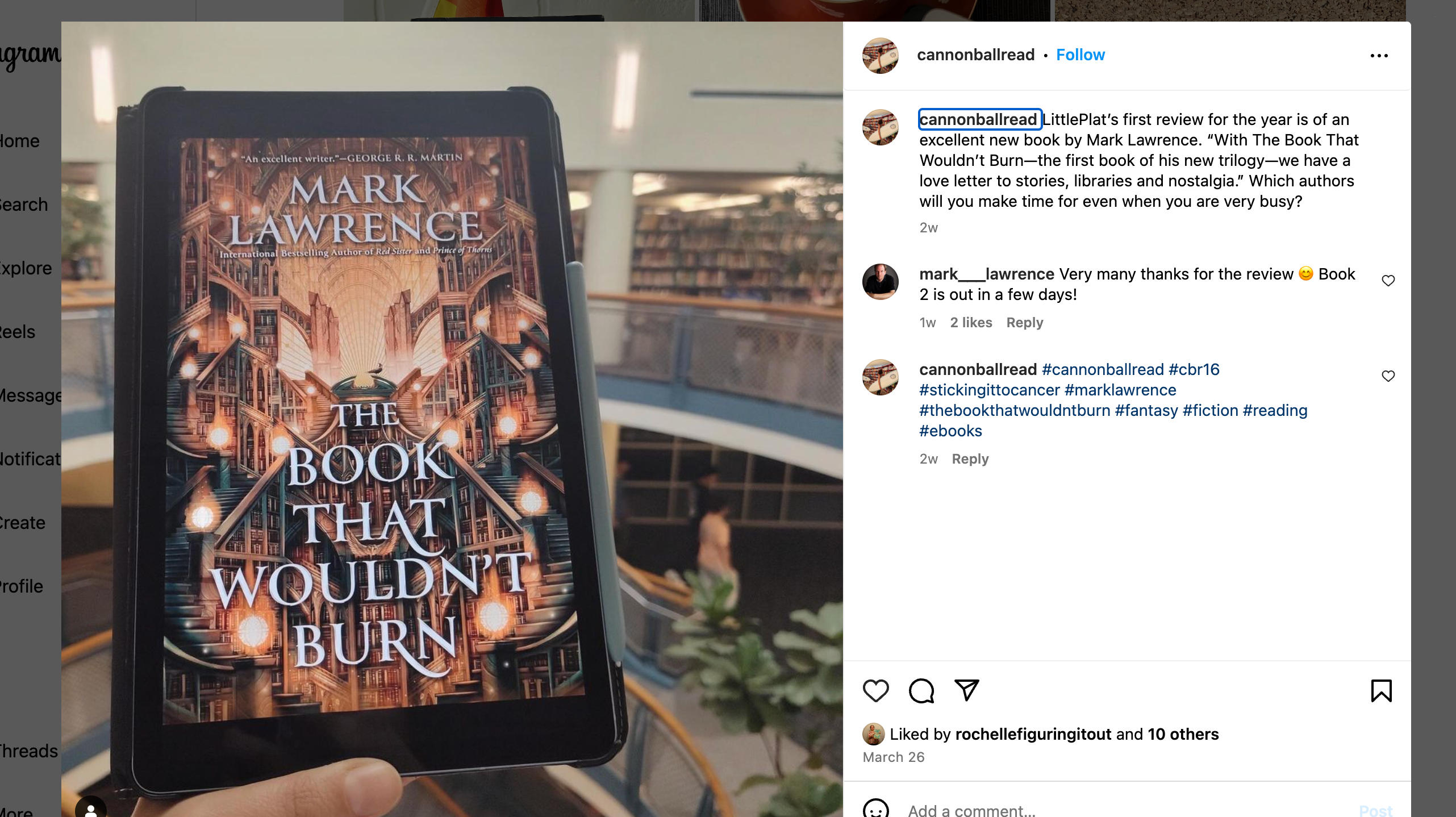- Author Mark Lawrence thanked LittlePlat for her review of The Book That Wouldn’t Burn on Instagram