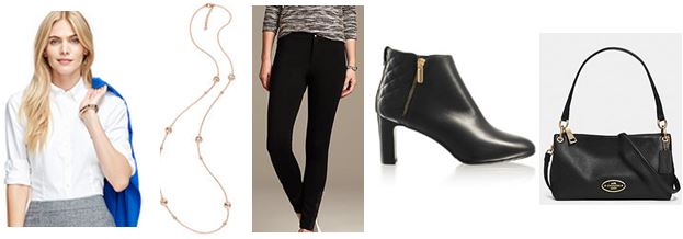 I speak at a lot of conferences and so I have to travel a lot. Brooks Brothers have a no-iron shirt in white which when paired with some Follie-Follie gold jewellery looks absolutely stunning against black trousers. Go with a long chain like the Follie-Follie Heart4Heart Win Necklace on the outside or double loop it for a shorter statement piece, attaching a small gold charm to the clasp. Go with some Banana Republic Faux-Leather Trim Ankle Zip Ponte Leggings in Black and then finish it off with a black Coach bag with gold hardware and Russell & Bromley HI-CHARM Quilted ankle boots which have gold hardware. I always find if you have silver hardware you have to pair with silver jewellery so I try and choose my jewellery to compliment elements I can’t change like hardware on a handbag.