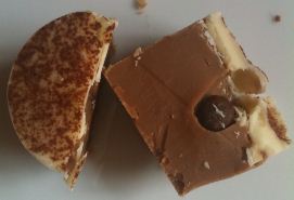 Strawberries & Cream – A white chocolate topped creamy white fudge mixed with dried strawberries. As with all reviewing, I took a small piece of fudge and immediately regretted it. As it melted in my mouth, I knew I was never going to be able to work off all the calories I was about to inhale as I took ever larger pieces. The strawberry pieces were yummy, the fudge had a lovely strawberry and cream flavour which didn’t have the usual synthetic edge possibly because there was no synthetic added flavour!