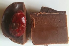 Cappuccino Milk Chocolate With Cinnamon – Milk chocolate fudge mixed with cinnamon & coffee essence covered with white chocolate & topped with a peaberry coffee bean. As you can see, the coffee bean was on the fudge and not the white chocolate. I’ve also altered the description as it described this as white fudge capped with milk choc and it clearly is not. As to the taste – wow. A gentle build to the cinnamon with a not-too aggressive coffee flavour. I wish there wasn’t the white chocolate here because I feel it detracts from the flavour for me because I’ve never liked it and this one has an excess of vanilla in it which overwhelms the flavour of the fudge at the end. I think if they change the white chocolate used or change it for maybe a sexy rich dark chocolate cap it’d be more of a winner for me.