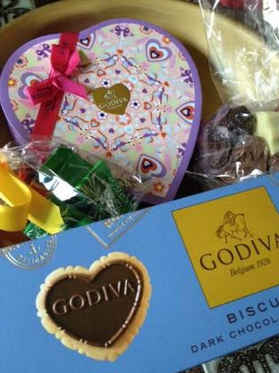 The Godiva chocolate selection in a heart with a more muted mauve and pint with mauve and red and white, etc coloured almost pseudo-paisley design. A welcome relief from garish red or pink and ribbons or bows. The lid has a small discreet ribbon which is also nice to see – less garish, more designer. The gold foil heart is a nice touch as well.