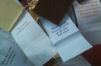 “Are exams getting easier?” “What was your best holiday and why?” “What is your favourite song of all time – and WHY?” “If you could have one thing back from your past that you’ve lost, what would it be?” These are the kinds of questions that might inspire interesting dinner conversation. They are also the kind of questions you don’t really expect to find on the back of a chocolate wrapper and yet as I tucked into a box of “Conversations” chocolates I had been sent by Green & Blacks, these were the exact questions I was confronted with.