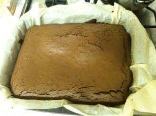 I pour this into the baking tin which is liked with paper and *whoops* you can see I did taste the mix by taking fingerfuls from the spatula.