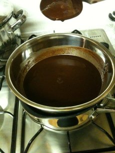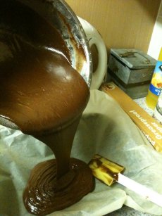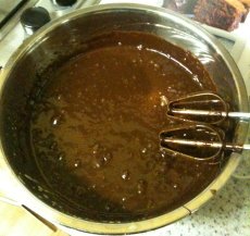 I melted the butter and chocolate slowly together. This is important as if you try and melt this in a pot over direct heat it is doomed to failure. I melted them in the bain-marie which was my metal mixing bowl over a pan of simmering water.