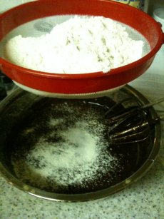 I then sift the flour and salt together into the mixture. As you can see, my “sieve” isn’t but hey – needs must!