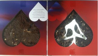 The dark chocolate I found to be a bit dry and, the best work I have for it is tough. It was as if in order to ensure structure they had created a lower cocoa butter content dark chocolate. Where the caramel was it was OK but still difficult to get through. The chocolate was OK but certainly not the quality of the Purist range which I have become a real fan of. It is still a nice dark chocolate which is not challenging. The flavour is slightly flat without the complexities of the Purist range but that doesn’t make it bad. The thickness of the heart means you are getting, I believe, 125g of mostly chocolate. A boast few other chocolate hearts can made as they use more filler, less chocolate. A dark chocolate fan will not help but enjoy this.
