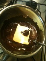 Now, before we go any further, get a pan of water simmering on the stove and a bowl on top of it – not touching the water – and place the butter in it. We’re melting the butter first, chocolate second. It’s OK to reverse it and I have but you have to whisk more if you reverse it as I did.