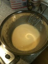 Take the powder and the milk and alternatively add this to the sugar and egg mixture, mixing it carefully but perhaps not with the hand mixer as I did (and ended up with a flour explosion). Blend in bit by bit, adding milk and flour alternatively. Once finished keep blending until flour is mixed in.